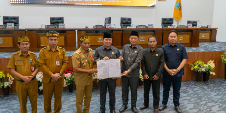 Rapat paripurna dilanjutkan penyerahan Rekomendasi LHP BPK RI atas LKPD Provinsi Kaltara 2024 oleh Ketua DPRD Provinsi Kaltara H. Achmad Djufrie kepada Gubernur Zainal didampingi Pj. Sekretaris Daerah Provinsi (Sekprov) Kaltara, Dr. Bustan, S.E., M.Si.