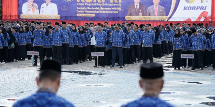 TANJUNG SELOR – Asisten Bidang Pemerintahan dan Kesejahteraan Rakyat Setdaprov Kalimantan Utara (Kaltara) H. Datu Iqro Ramadhan, S.Sos., M.Si memimpin upacara Peringatan Hari Ulang Tahun (HUT) Korps Pegawai Republik Indonesia (KORPRI) Ke-54 Tahun 2025, lingkungan Pemerintah Provinsi (Pemprov) Kaltara di Lapangan Agatis, Senin (1/12).
